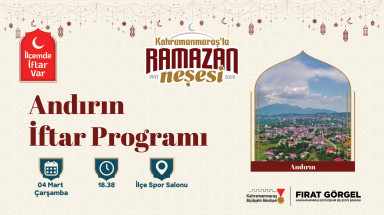 Büyükşehir Belediyesinin “İlçemde İftar Var” programının yeni durağı Andırın olacak. 4 Mart Çarşamba günü İlçe Spor Salonu’nda kurulacak iftar sofrasında yüzlerce vatandaş hep birlikte oruçlarını açacak. İftar programına tüm Andırınlılar davet edildi.