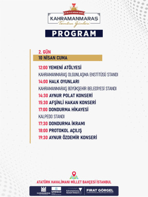 Kahramanmaraş’ın tarihinden günümüze uzanan hikâyesinin renkler, kokular ve dokular eşliğinde aktarılacağı etkinlikte, kültür, sanat ve eğlence iç içe geçecek. Organizasyonun ilk günü olan 9 Nisan’da; halk oyunları gösterileri ve belediyelerin stantlarında yöresel lezzetler ile tarihi değerlerin tanıtımı gerçekleştirilecek. 10 Nisan Cuma günü programı kapsamında Yemeni Atölyesi ve halk oyunları gösterileri düzenlenecek. Aynı gün saat 14.30’da Aynur Polat, 15.30’da Afşinli Hakan ve 19.30’da Aynur Özdemir sahne alacak. Saat 18.00’da ise Tanıtım Günleri’nin resmi açılışı gerçekleştirilecek. 11 Nisan Cumartesi günü de etkinlikler hız kesmeden devam edecek. Halk oyunları gösterisi ve dondurma şovun yanı sıra saat 14.00’da Furkan Pehlivan sahne alacak. Günün finalinde ise saat 19.00’da sevilen sanatçı Kıraç, en sevilen eserlerini seslendirerek katılımcılara unutulmaz bir konser verecek. Organizasyonun son günü olan 12 Nisan Pazar günü ise ahşap oyuncak ve yemeni atölyeleri, halk oyunları gösterileri ile ziyaretçilere dolu dolu bir program sunulacak. Saat 16.00’da Yaşar Gören, 17.30’da ise Şevket Gürlek sahne alacak.